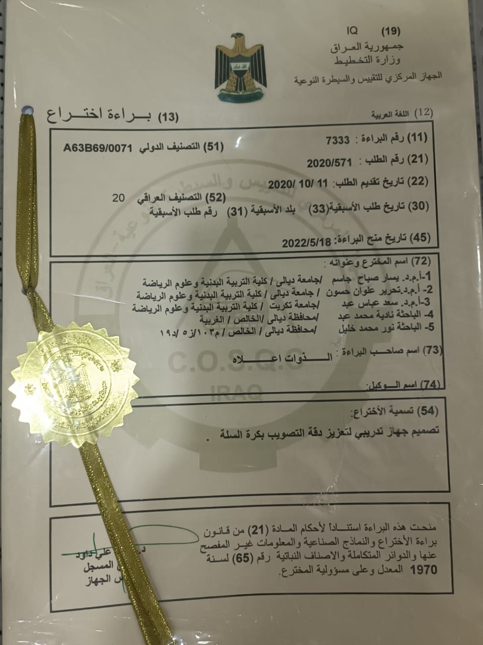 | ت | الاسم الثلاثي | اسم براءة الاختراع | رقم البراءة | تاريخها |