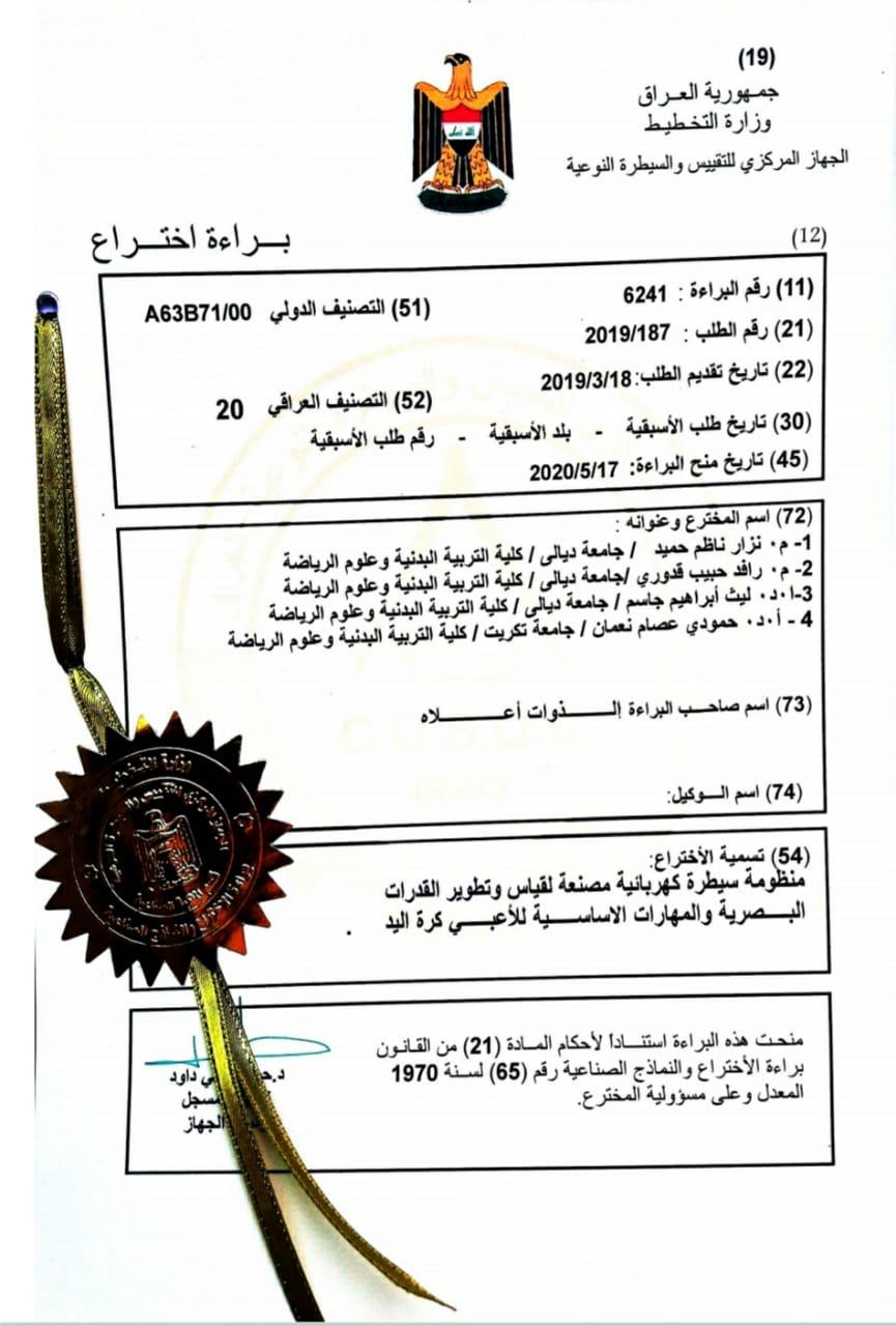 | 1 | أ.د حمودي عصام نعمان | منظومة سيطرة كهربائية مصنعة لقياس وتطوير القدرات البصرية والمهارات الاساسية للاعبي كرة اليد | 6241 | 2020 |